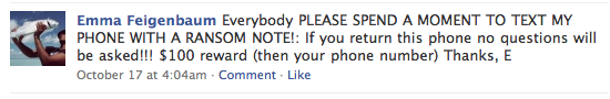 It turns out, it was a banner social media day. The reason I was receiving so many texts on the iPhone is Emma wrote this note on her Facebook wall: